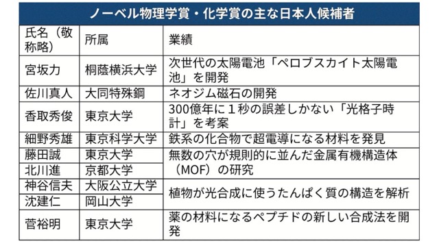 (切抜)日本人では次世代の太陽電池を開発した桐蔭横浜大学の宮坂力特任教授や、分子がひとりでに組み上がる「自己組織化」の現象を研究した東京大学の藤田誠卓越教授らが有力候補にあがる。