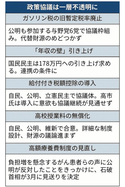 公明が重視した「政治とカネ」に関する基本姿勢で意見の相違があった。企業・団体献金の受け手を党本部と都道府県連に絞る規制強化の実現を求めたが、回答は「これから検討」という不十分なもので極めて残念だ。✍️加えて前記事にもある少数与党では公明党の政策実現は困難と見たようだ。いずれの党も脆弱化を免れない事態だ。