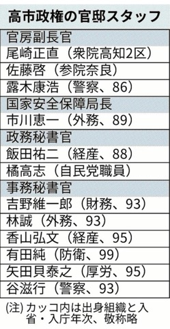 [概要]高市早苗首相は首相官邸のスタッフの陣容を固めた。安倍晋三政権をモデルとし、自身が重視する積極的な財政政策などの政治課題や日本維新の会が重視する社会保障政策に精通した人材も配置した。
