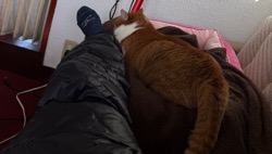 吾輩がソファで一休みの体制をとると、すかさず飛び降りて足元にやってきた。温かいところで日向ぼっこより狭くても人と触れていたいようだ。お互い様か😸