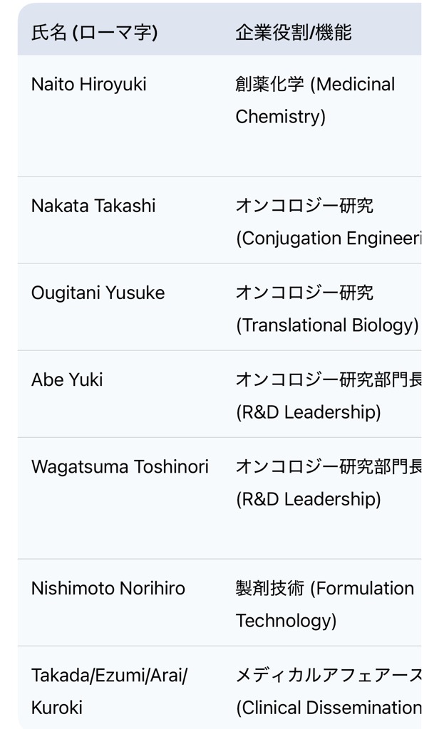 📌 第一三共が開発した抗がん剤「エンハーツ」の開発を主導した中核的な研究者は、阿部 有生 氏、内藤 博之 氏、中田 隆 氏、および扇谷 祐輔 氏の四名であると特定されます 。彼らは、創薬化学、コンジュゲーション工学、およびオンコロジー生物学という異なる専門分野を統合することで、T-DXdという画期的な分子実体を生み出しました。