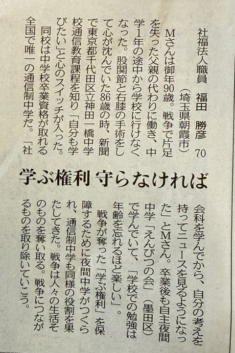 今朝の東京新聞の読者投稿欄。そこには、私の大切な友人であるMさんのこれまでの歩みが綴られていましたので、記念に残しておきたいと思いました。