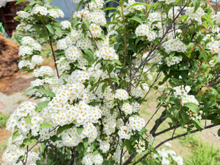 コデマリ(小手毬)→白く丸く多数の花が密集。庭木としてあちこちに見受けられる春先の典型的な人気花である。白い花では、あと2、3思いつく。